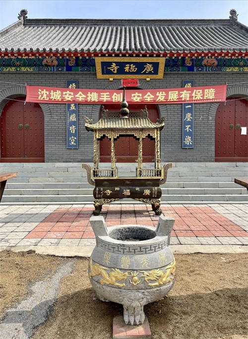 沈阳广福寺依山而立,大雄宝殿气势雄伟庄严,前堂远亮,后靠宝山,在案缓屏直,四重相望。东西配殿是观音殿、地藏殿。