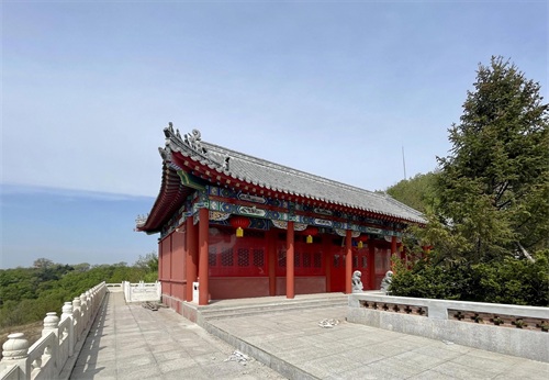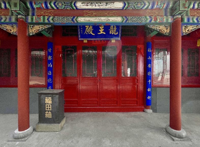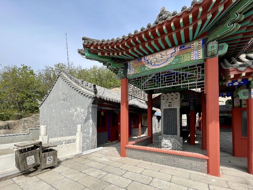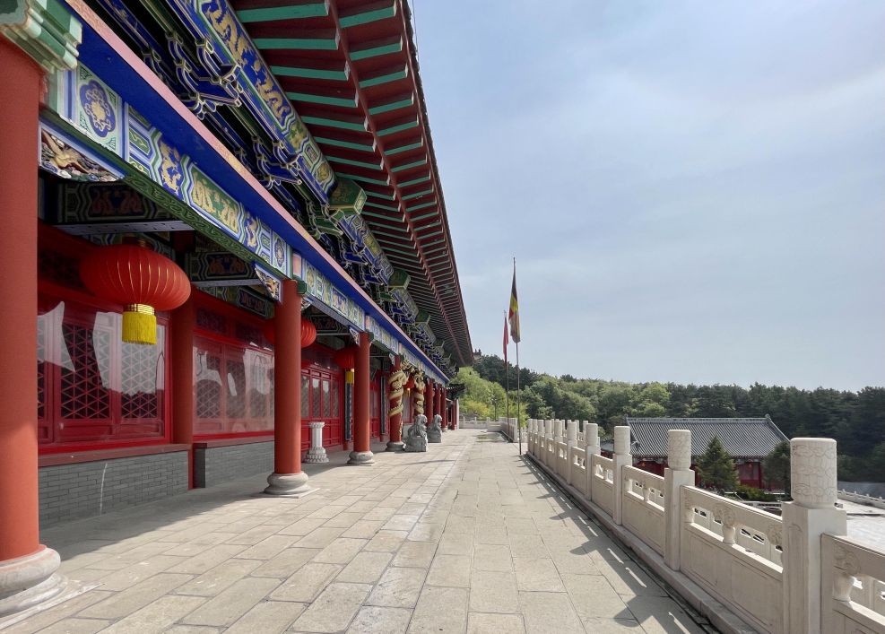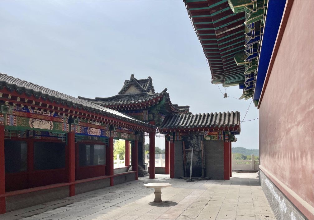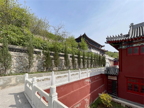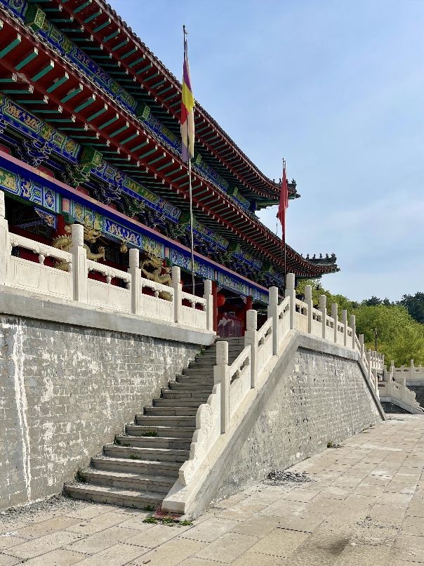 大雄宝殿仿清庑殿式,双重檐,七开间,九条脊建筑。金龙和玺彩绘,汉白玉勾栏。青石板踏步、青石板地面。大殿两旁是东西碑廊,肃穆典雅,富丽庄严。东碑廊边是龙王殿、土地庙,西碑廊边是护法殿。