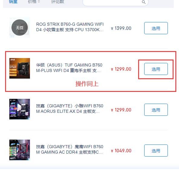 挑选主板。如下图所示,同上操作,我们点击“品牌”-“华硕”,先筛选出我们想用的主板品牌,比如下图的华硕,再选择具体主板型号,这里选择华硕(ASUS)TUF GAMING B760M-PLUS WIFI D4 重炮手主板。