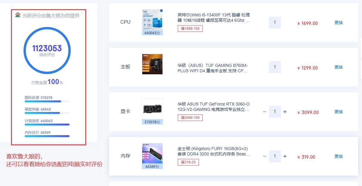 6、喜欢鲁大娘,追求跑分的小白,还可以在装机页面的左边实时地看到你挑选电脑评分,如果想要更高的分,就得花更多的钱选择更好的配件了,建议量力而行,因为用不上的性能就浪费了。