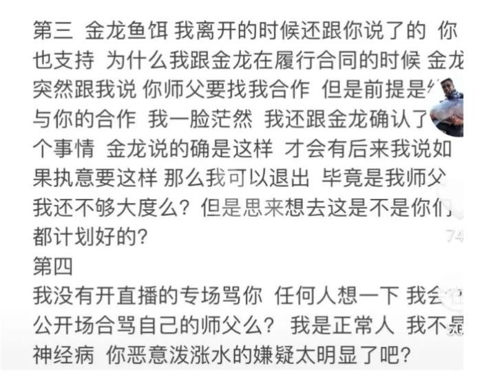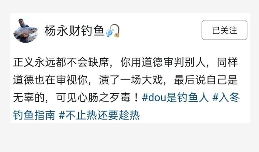 三、在理想状态,师徒之间会相互扶持,尽心尽力,传授学识,只是钓鱼圈哪有那么多知识,技巧可言,完全就是一层窗户纸,捅破了就捅破了,而如果双方没有发生矛盾,看两人《游钓江湖》还真是走遍大江南北,羡煞旁人。正常来说,徒弟对师傅不满,有涵养的应该不露分毫,进退有度,寻机会退出师门,另谋他路,原本杨永财以照顾家庭为理由退出,是很好的选择和理由,却不知道为何又在年底的时候大爆猛料,让李大毛在过年时候如坐针毡。