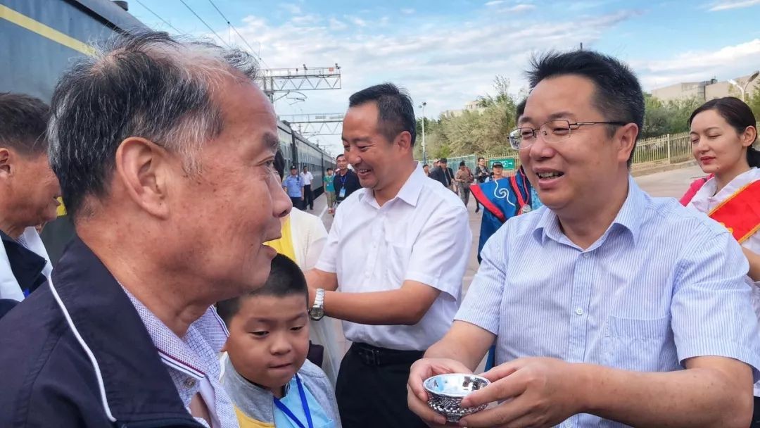 新疆博尔塔拉蒙古自治州党委副书记安涛同志向旅客献哈达