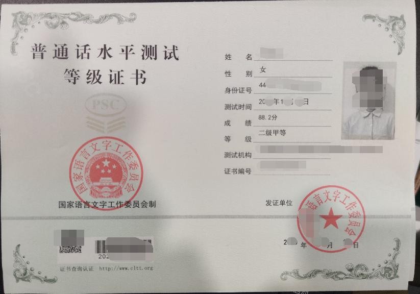 真实的普通话是国网可查的,左下角有官方网址,大家一定要记得,并且是附带查询二维码和条码的,因为涉及隐私所以小编打了码。右下角是由各地的语委盖章,右边是标注有考试学员的基本信息。