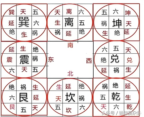 伏位方:西南、坤卦。生气方:东北、艮卦。延年方:西北、乾卦。天医方:西方、兑卦。绝命方:北方、坎卦。五鬼方:东南、巽卦。祸害方:东方、震卦。六煞方:南方、离卦。