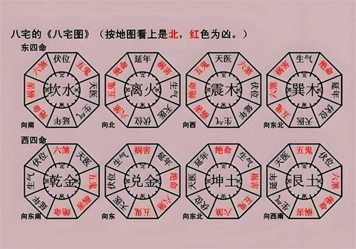 坐北向南宅北宅[坎] 东(天医位)南(延年位)西(祸害位)北(伏位)东南(生气位)西南(绝命位)西北(六煞位)东北(五鬼位)