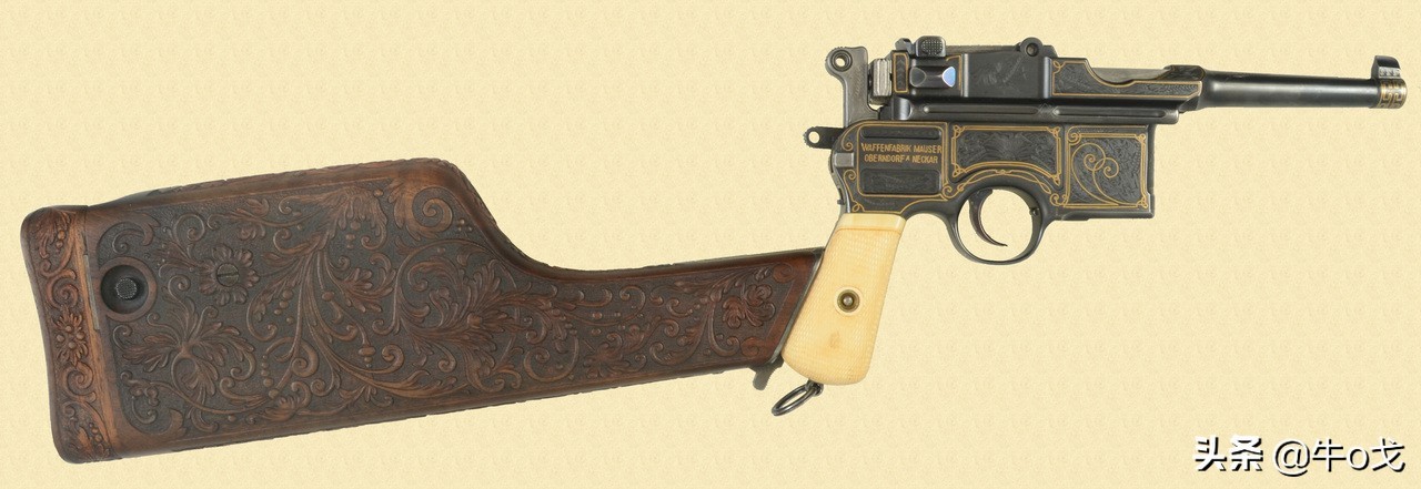 枪的握把不是硬木,而是象牙。握把后端有卡槽,那是用来连接木制枪套用的。