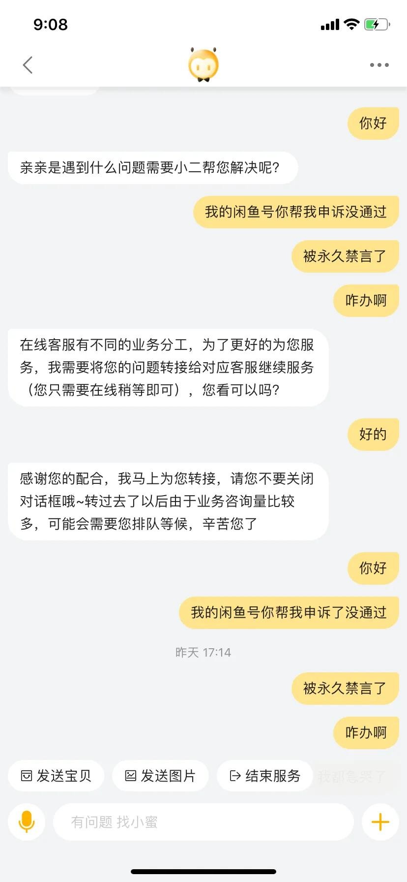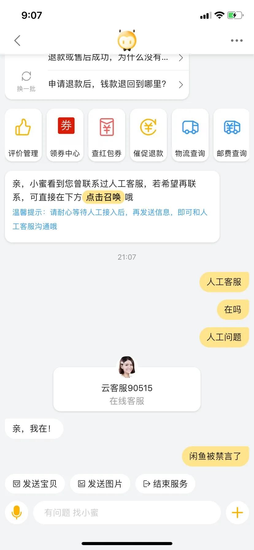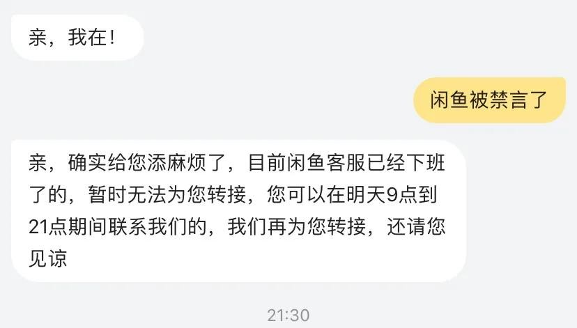 用自己闲鱼号关联的淘宝号去联系淘宝客服,这样会更快捷的联系到客服,他们的工作时间为9:00–21:00,所以我们要在这个期间联系他们。直接向他们反映我们的问题,他们就会热心的帮忙处理了!