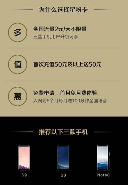 三星联合联通推出星粉卡,3月16日正式上线办理。 月租仅需5元!!! 每天2元即可享受无限全国流量!所有APP都不限制啊! 办理首月免月租体验,前6个月每月送100分钟全国语音通话。首充50送50。