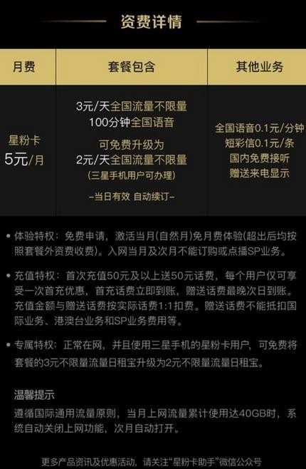 三星联合中国联通推出的星粉卡正式上线,官方公布了星粉卡的套餐与购买细则。星粉卡月租费为5元/月,其中包含3元/天全国流量不限量和100分钟的全国语音,超出后的语音机短彩信均为0.1元/分钟/条,国内免费接听,并赠送来电显示。三星手机用户还可免费升级为2元/天的全国流量不限量。