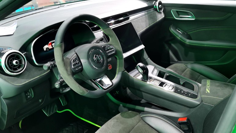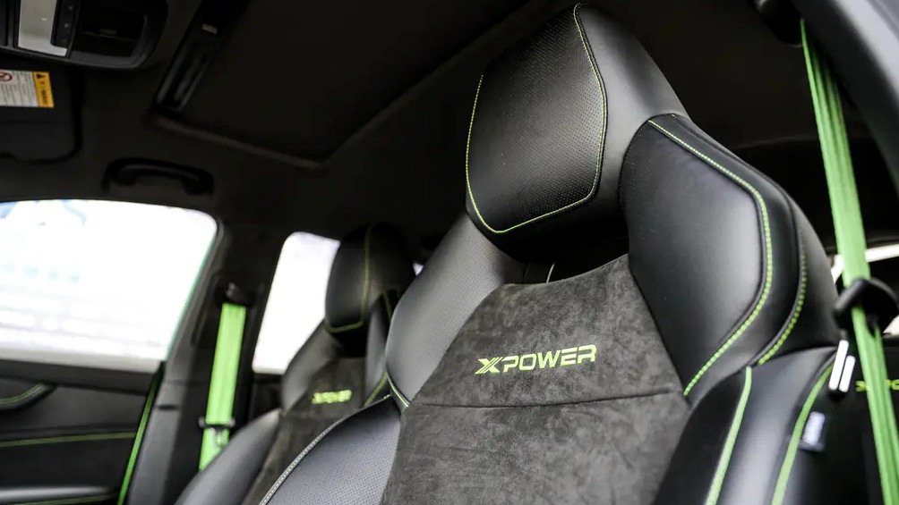 这款XPOWER基于名爵6插混版打造,"骐骥绿"色金属涂装车漆。搭配各种大尺寸的扰流板,进气口,前后包围,尾翼等运动改装件,另外轮毂也搭配了铝合金锻造轮毂,可以说从头到尾改装到牙齿。再来看内饰方面,基本配置没变,而在用料及做工上更加考究,缝线上为了和外观车系呼应采用绿色缝线,座椅以及方向盘均采用了翻毛皮设计,感受更佳,但也不容易打理。