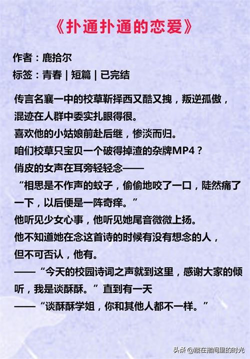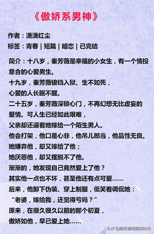 推荐理由:一本校园暗恋文。文章用倒叙的方式来回忆青春时期的青涩暗恋。看完让人很感动,喜欢一个人就要让对方知道,不管结果如何,至少不会留下遗憾。书中女主对陆维安的暗恋很深很深,无法自拔,她做的每一个决定都和陆维安有关。有点心疼这样的女主,明明有那么好的家世,却总是很自卑,总感觉自己配不上陆维安。写得很贴近社会,我在等你,曾让我一度以为是女主在等男主,看到最后才发现,是男主在等女主。很感动,我终于等到了你!