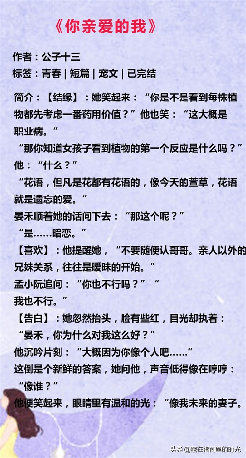 推荐理由:男主是一名中医,文中的每个章节都是一个药名,很有特色。男主刚认识女主的时候就对她很好,我还以为他是喜欢女主,然而不是。他是与女主相处的过程中才渐渐喜欢上她的,女主身上有很多宝贵的东西,她的豁达善良教会了男主什么是爱,什么是情,什么值得珍惜值得坚守。故事平淡温馨,超治愈~