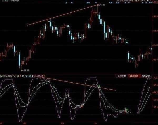 4、从K线和D线背离方面考虑。如果在呈股价上升趋势的同时,k线和D线逐渐走低,这形成了顶背离,这是一个见顶信号,预示着股价将会下跌,持有该股者应该获利出局;如果在呈股价下降趋势的同时,k线和D线逐渐走高,这形成了底背离,这是一个见底信号,预示着股价将会反转向上,投资者可以逢低吸筹。