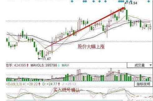 针对KDJ指标的用法来说,其最能简单明了的展现某只股票走势状况及买卖点位,KDJ、MACD、RSI等指标会在不同的位置、区域上表现其代表的意义,从而可以帮助投资者分析买卖时机,下面就通过案例来为大家展示一下KDJ指标的买入信号: