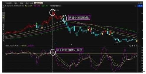 1、股价前期出现很大涨幅,随后下调,J线和K线在高位(80附近)几乎同时向下突破D线形成死叉,股价也同时跌破中短期均线,说明股价将转为弱势,后期将出现下跌行情,80附近的高位死叉,投资者应及时离场。