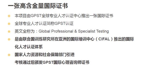 △市面上出现了“联合国”推出的GPST国际心理咨询师证书。 华东人才专修学院是这项联合国心理咨询师课程唯一指定的培训机构。记者以求学者身份咨询该机构的一名“秦老师”。他称,国际注册心理咨询师的发证方为联合国培训研究所下面的亚太中心。记者询问该证书是否受到业界认可?对方的说法是,虽然不是从业必备证书,但 “含金量不低”,“很权威”,比中科院心理所开展的基础培训课程更加专业,是对能力的认定。 GPST项目在官网宣称,他们的全球专业人才项目在2010年由国家人社部、上海市政府相关部门推进。吴女士拿到的中级“国际心理咨询师”证书上,落款有联合国培训研究所的助理秘书长Nikhil Seth签名、认证编号和时间、GPST项目的钢戳印以及印有中文字符的“联合国训练研究所上海国际培训中心”盖章,看似十分“权威”。
