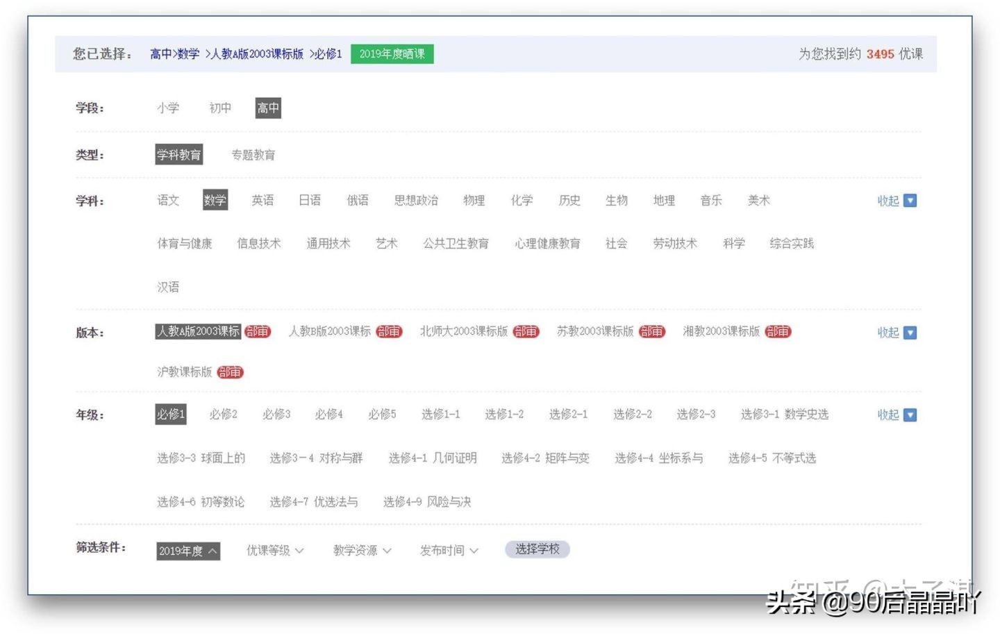 它支持强大的课程筛选功能,你可以按照学段、类型、学科、版本、年级、发布时间进行筛选,你甚至还可以通过选择学校来筛选课程。