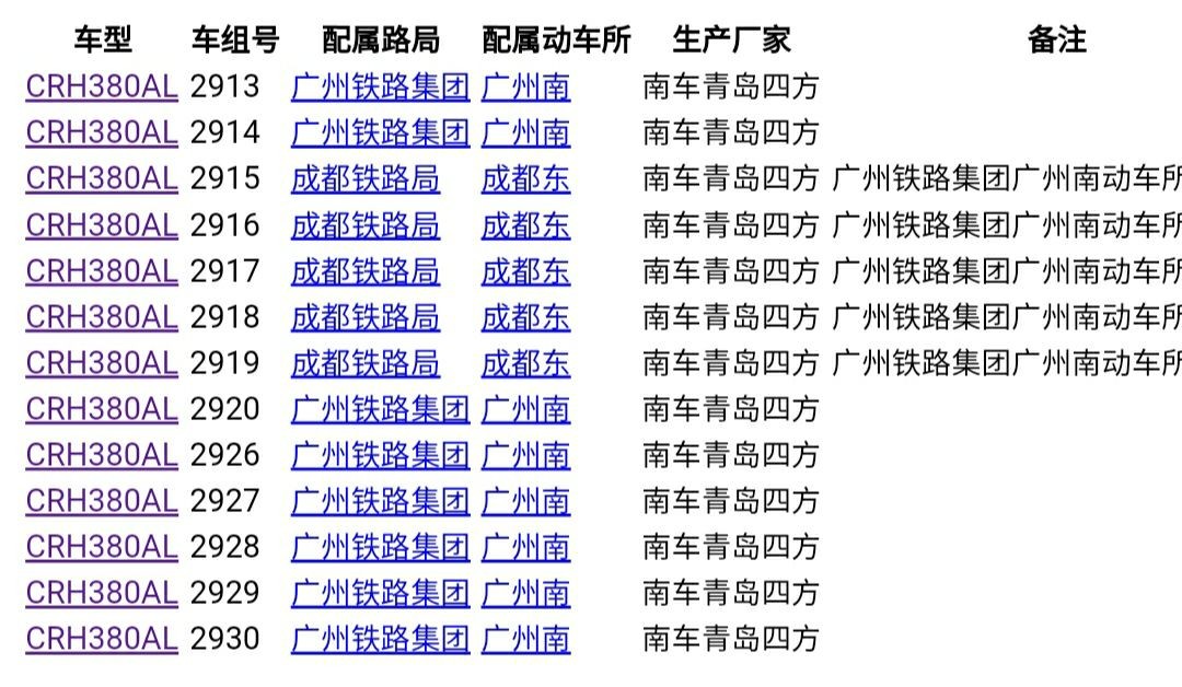CRH380AL总计生产113列,活跃在北京、广州、成都、西安、武汉、郑州、南昌铁路局,具体配属表如下: