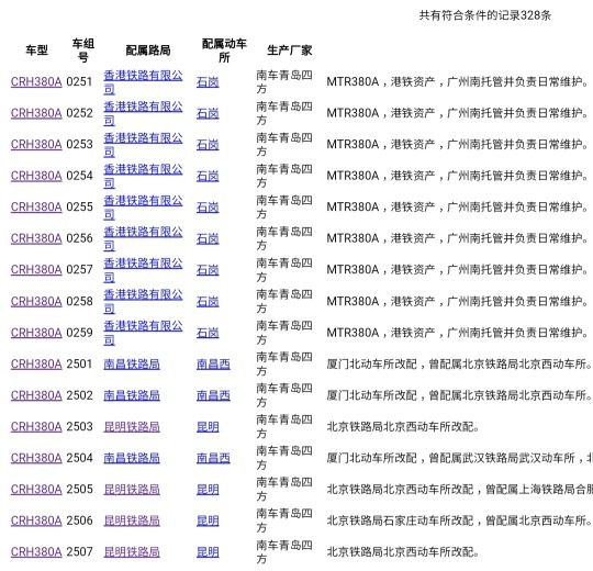 CRH380A总共生产328列,在高速动车组里,数量仅次于CRH380B,成都铁路局、广州铁路集团、南昌铁路局、昆明铁路局、南宁铁路局、太原铁路局、武汉铁路局、郑州铁路局均有配属。(上海铁路局以前也配属了CRH380A,而且是最先配属,后来由于动车集中配属原则,加上动局青睐长客的列车,动局逐步变成了兔子窝)配属表如下(由于数量太多,就不一一展示了)。