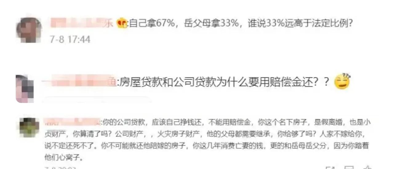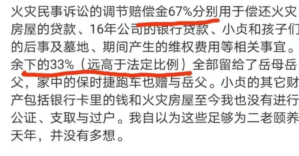 并说明了赔偿款的来龙去脉,大部分已分别用于偿还被烧毁房屋贷款的尾款、事发前公司的贷款,亡妻和三个孩子的后事等,且已有给小贞的父母超出法定比例33%的赔偿金,并晒出了给岳母发红包的聊天记录。