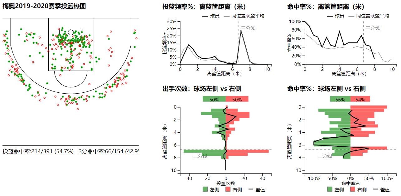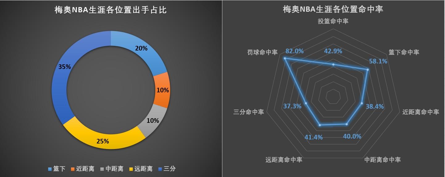 梅奥NBA生涯各位置出手占比及命中率
