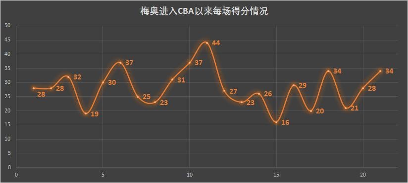 除了覆盖全场的的出手范围和高命中率之外,梅奥的发挥也非常稳定,加盟辽篮以后梅奥一共打了21场比赛,其中只有2场比赛得分低于20分,有15场比赛得分大于25分,十分稳定地为球队提供了足够的进攻火力。