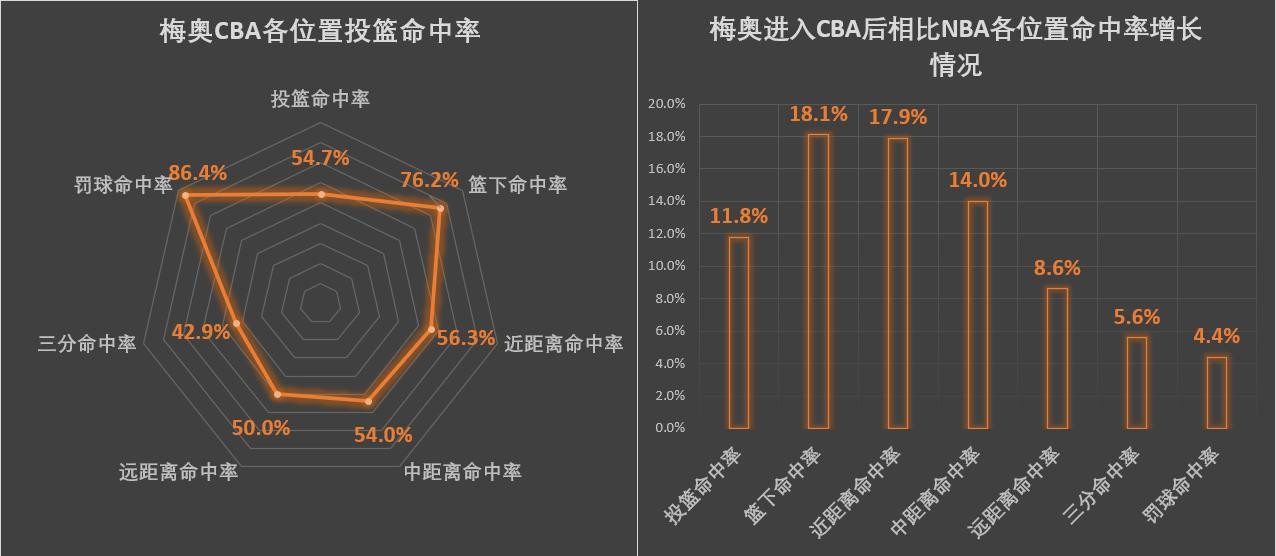 梅奥CBA各位置命中率及相比NBA增长情况