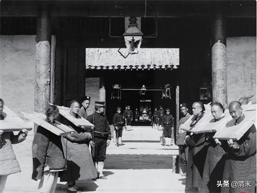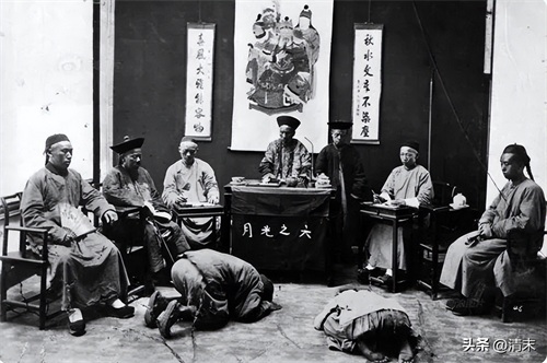 这张图片中展示的衙门和我们在电视中见到的很不一样。从现场人的身着就可以判断,这是一个贫穷地方的衙门。在电视剧中所展示的衙门往往都是案台设置在屋内比较高的位置十分威严,而图片中所展示的案台却在大堂正中,案台也十分简陋。