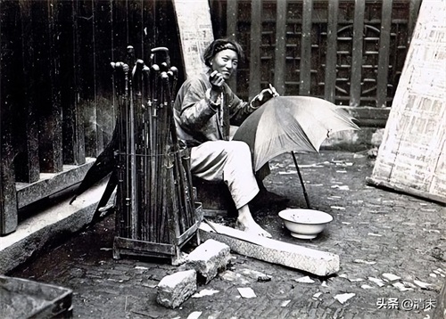 是来自于清末民初易代之下的老照片。通过这一组照片,我们可以来看看当时底层百姓艰难的日常生活。照片拍摄于清末民初时期,一名修伞工在街边摆摊,这个工作时常要面临风吹日晒,而收入也是微薄的。而如今这项技术已经很难看到了,现在的人跟以前的人不同,以前坏掉的东西,人们会想着修一修还能用,而现在东西坏掉了人们想得就是还新的。