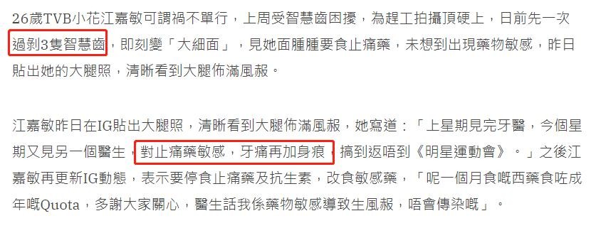 TVB花旦江嘉敏前几天一次性拔掉3颗智慧齿。剥完牙齿后,她的脸肿了起来,只能吃药止痛。