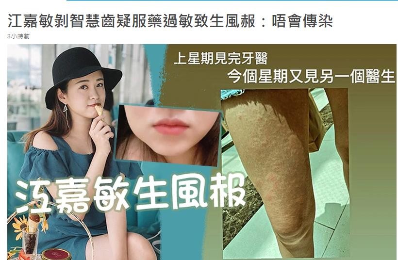 6月22日,根据港媒的报道,26岁女星江嘉敏拔牙后药物过敏,腿上长满了小疙瘩。