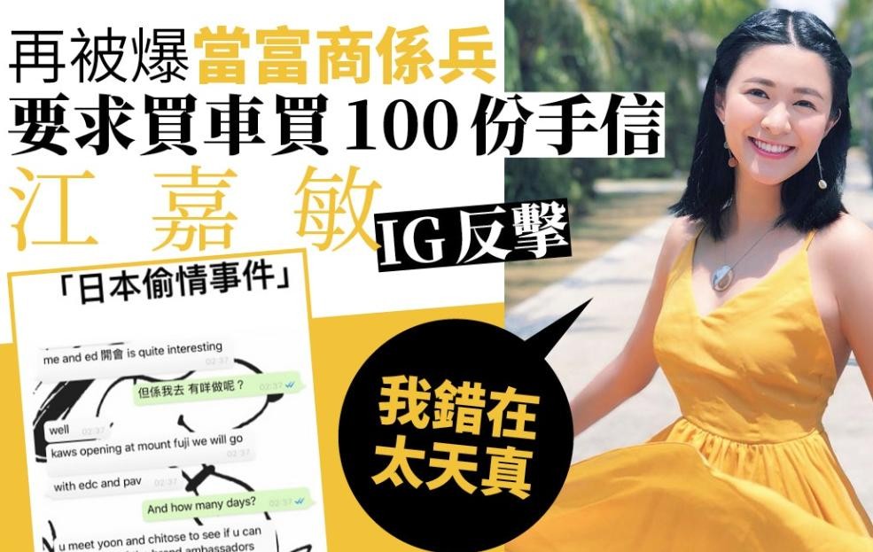 事件平息没多久,又有人曝光江嘉敏与粉丝的聊天记录,对方还痛斥她是双面人,把粉丝当佣人一样对待,叫粉丝买手信却不说什么时候交收,让粉丝等了很久。
