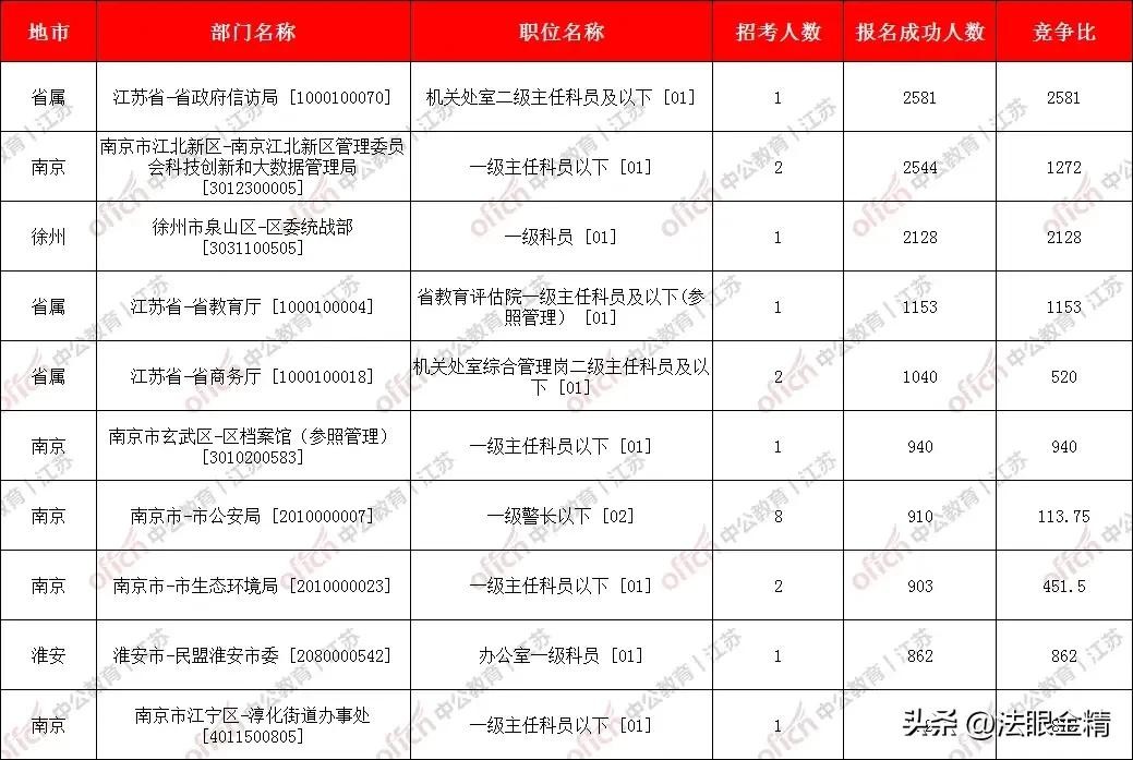 从上述图中,2023年江苏省考报名人数来看,前十名竞争最激烈的岗位中有5个都来自南京,如果算上省属的岗位,那十个里面有八个工作地点都在南京。