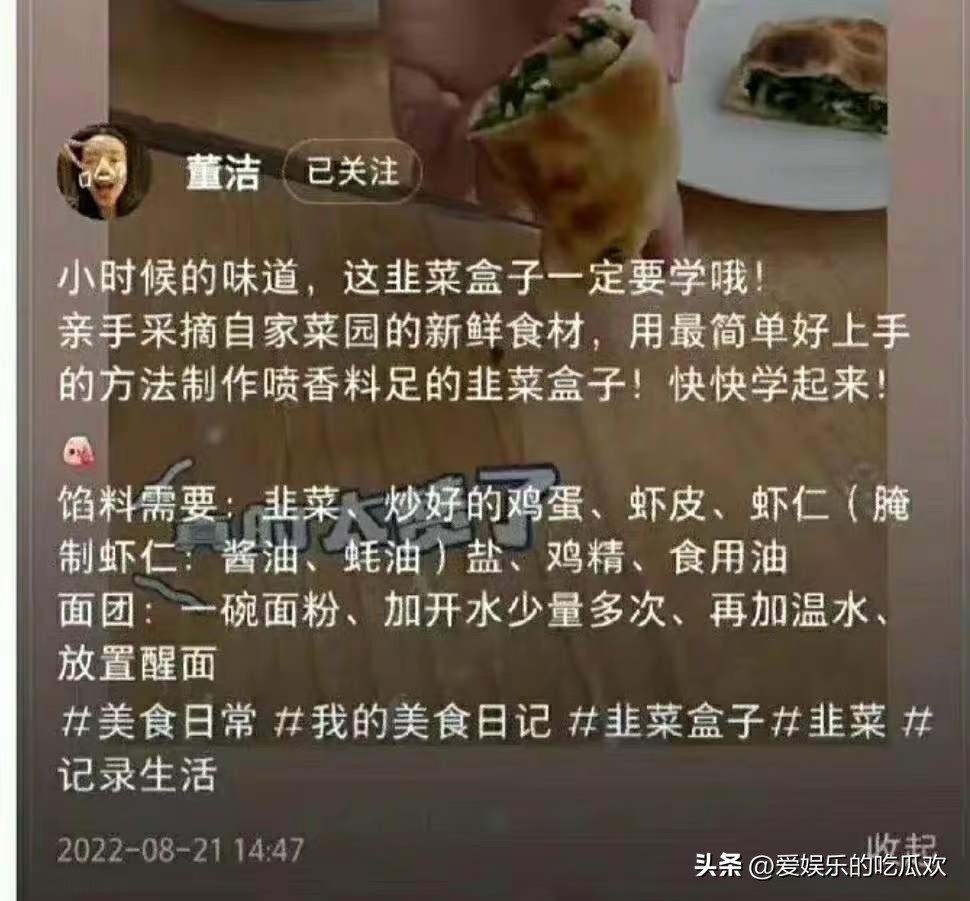 原来去年8月份董洁刚分享了韭菜盒子的做法,不到一周,潘粤明就紧随其后,在社交平台晒出来了一张韭菜盒子的照片。