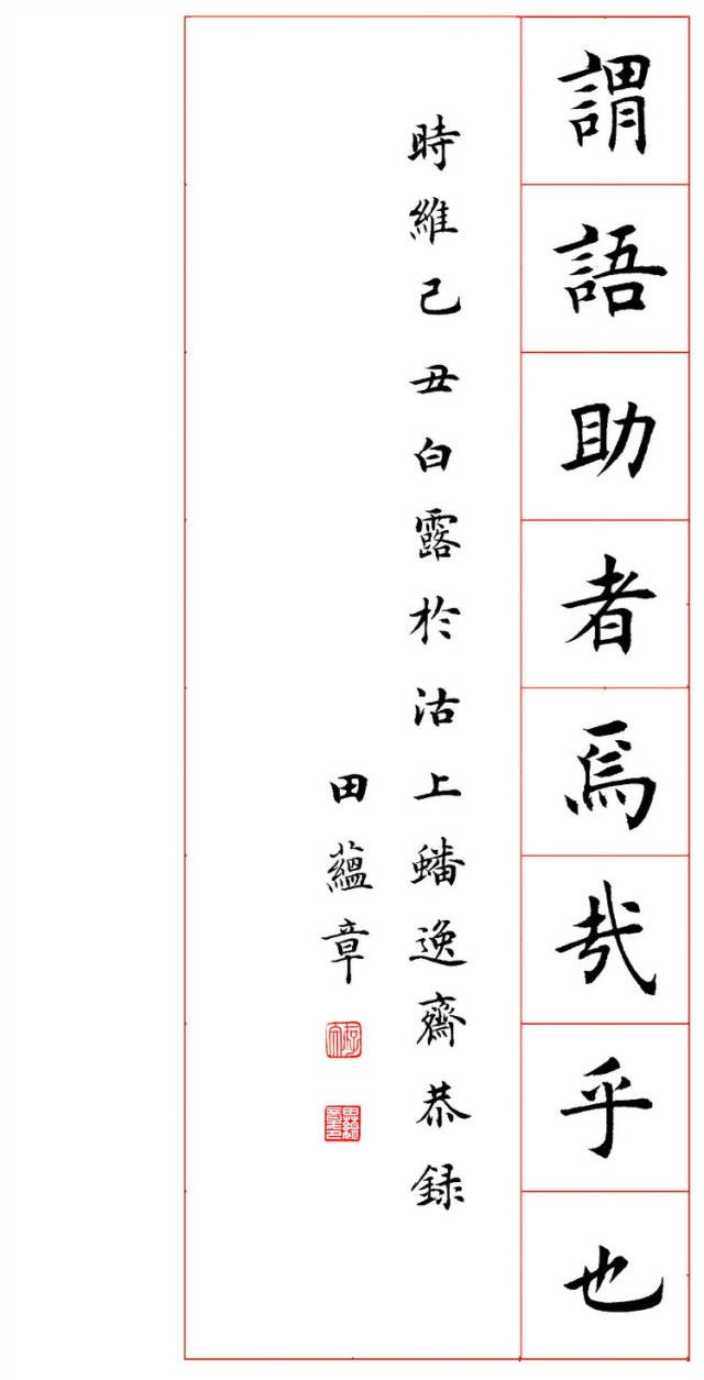田蕴章,田荫亭之长子,字存文,蟠逸斋主人。原籍河北省河间县卧佛堂乡河西村。田蕴章幼秉庭训,始攻欧书,聪颖好学,勤勉过人,青年时期便已负书名。后遍临历代名家,融会贯通,自成风格,长于楷法,兼精行草。