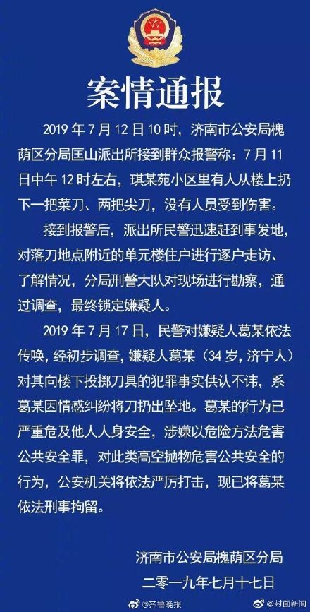 【 警方通报小区天降三把菜刀 :嫌疑人已被刑拘】近日,山东济南槐荫区一小区上演惊魂一幕。祖孙前脚刚进单元门,三把菜刀就从天而降,所幸未造成人员伤亡。17日,槐荫区匡山派出所发布通报称,经初步调查,嫌疑人葛某(34岁,济宁人)对其向楼下投掷刀具的犯罪事实供认不讳,系葛某因情感纠纷将刀扔出坠地。现已将葛某依法刑事拘留。(齐鲁晚报)