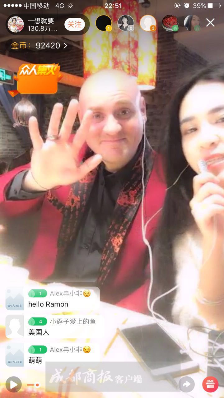 神曲爆红后,Ramon也晋升为一名网红。1月24日晚,Ramon参与到成都商报全国首档火锅直播栏目《一想就要》中,和大家一起互动。直播3个小时,最高同时在线有6.9万人,直播结束时观看总量高达130多万,十分火爆,网友纷纷表示他让世界爱上了火锅、爱上了成都味。