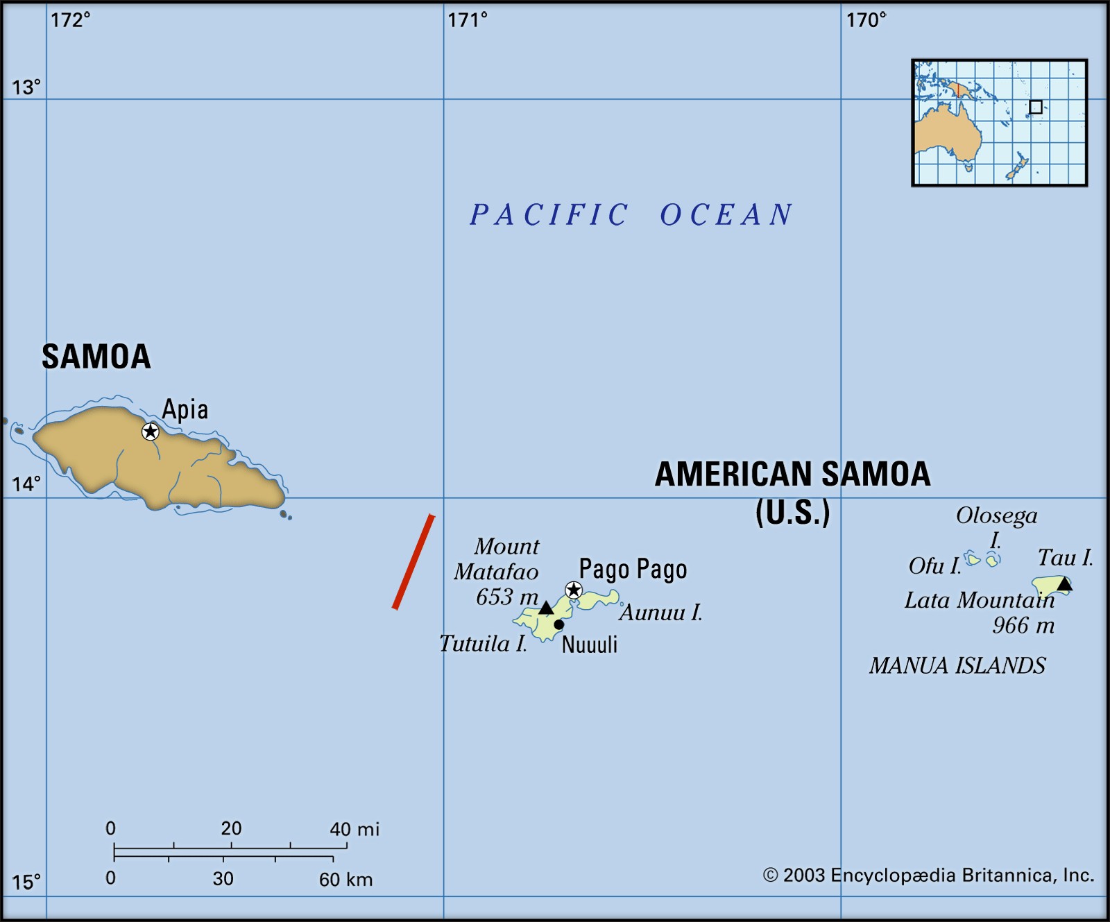 美属萨摩亚位于南太平洋波利尼西亚岛群中南部,由五个火山岛和两个珊瑚礁组成,面积199平方公里。人口不到6万,主要集中在最大的图图伊拉岛(Tutuila)上。