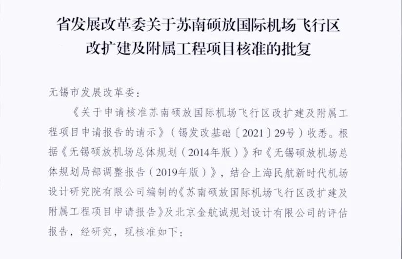 12月21日,省发展和改革委员会官网公布消息,《关于苏南硕放国际机场飞行区改扩建及附属工程项目核准的批复》已办结通过。这标志着,苏南硕放机场飞行区改扩建及附属工程项目获得批复。