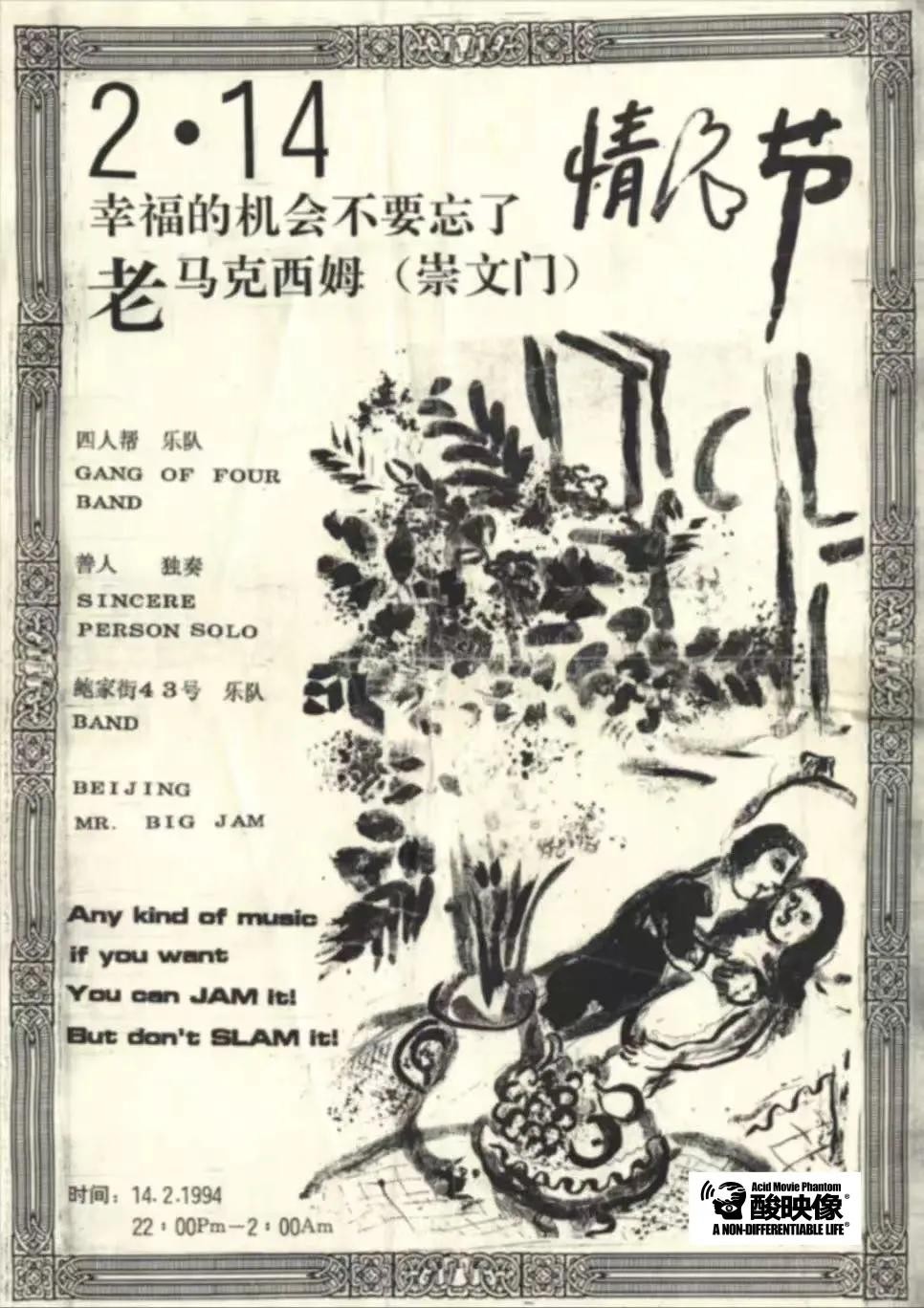 海报中的穴位乐队,成立于1992年的秋天,包括主唱秦思源、鼓手余伟民、键盘手李益、吉他手陈底里、贝斯手道尔吉。他们首次公演就是为崔健暖场。之后他们时常在马克西姆演出,并与窦唯、何勇同台。1994年穴位的鼓手余伟民成为何勇的鼓手,参加了当年的红磡演唱会,不过乐队也在那一年解散。他们只留下了一首歌叫《微不足道》,收录在《北京摇滚2》专辑中。