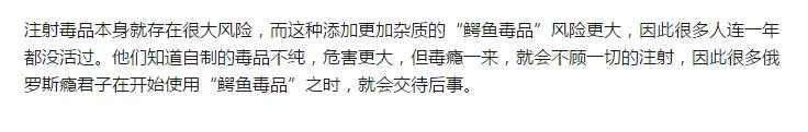 吸食“鳄鱼毒品”会导致吸食者出现肌肉、皮肤腐烂脱落,露出白骨,为什么他们看到这样的情况,还不停止吸食呢?这是因为“鳄鱼毒品”与海洛因一样,停吸就会出现生不如死的戒断反应,这个时候不吸,还不如杀了他们。