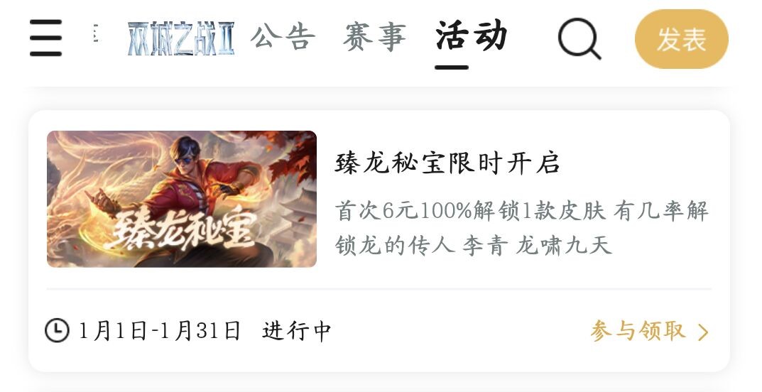 活动规则:花费29元可开启一次臻龙秘宝,100%获得一个奖池内优先未拥有皮肤和臻龙秘宝碎片,还有小几率会获得福袋,首次开启仅需6元。