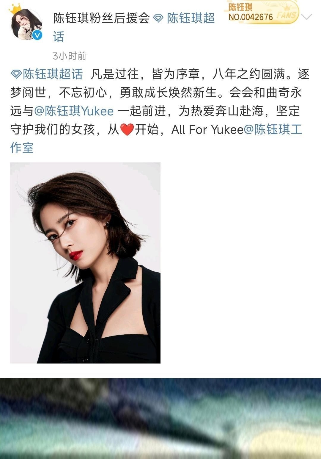 陈钰琪的粉丝后援会在社交平台发文表示“凡是过往,皆为序章,八年之约圆满。逐梦阅世,不忘初心,勇敢成长焕然新生”,似乎对她的决定表示支持。据悉,陈钰琪和原公司的合约已经到期,这也意味着她将开始一个崭新的阶段。