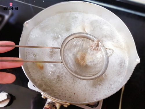 烧开后撇去浮沫,倒入料酒,转中小火煮20分钟。料酒和姜片都是为了去腥用的。