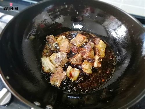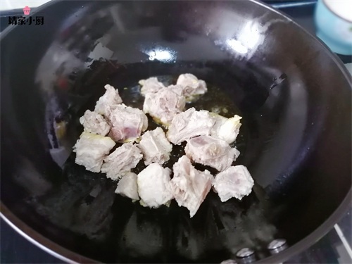 另起锅,锅中倒入30克食用油,烧热后倒入控水后的排骨,开中火煎炸排骨。煎的时候记得时不时的翻动排骨,这样才能煎的颜色均匀。