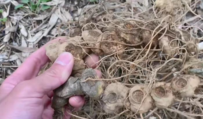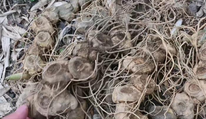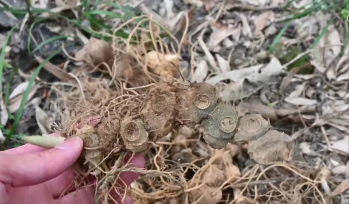 一般挖取这个黄精,挑选年份久块茎茁壮的,黄金年份不够或是比较瘦小的这种我们挖回来,可以直接扔在附近的竹林下面让它繁殖。到时候幼苗生长多年,野生资源才不会枯竭。