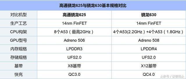 而骁龙630作为骁龙625/626的接班人,是否对得起“一代神U”这个称号呢。我们来看一下这两颗处理器的主要参数对比。