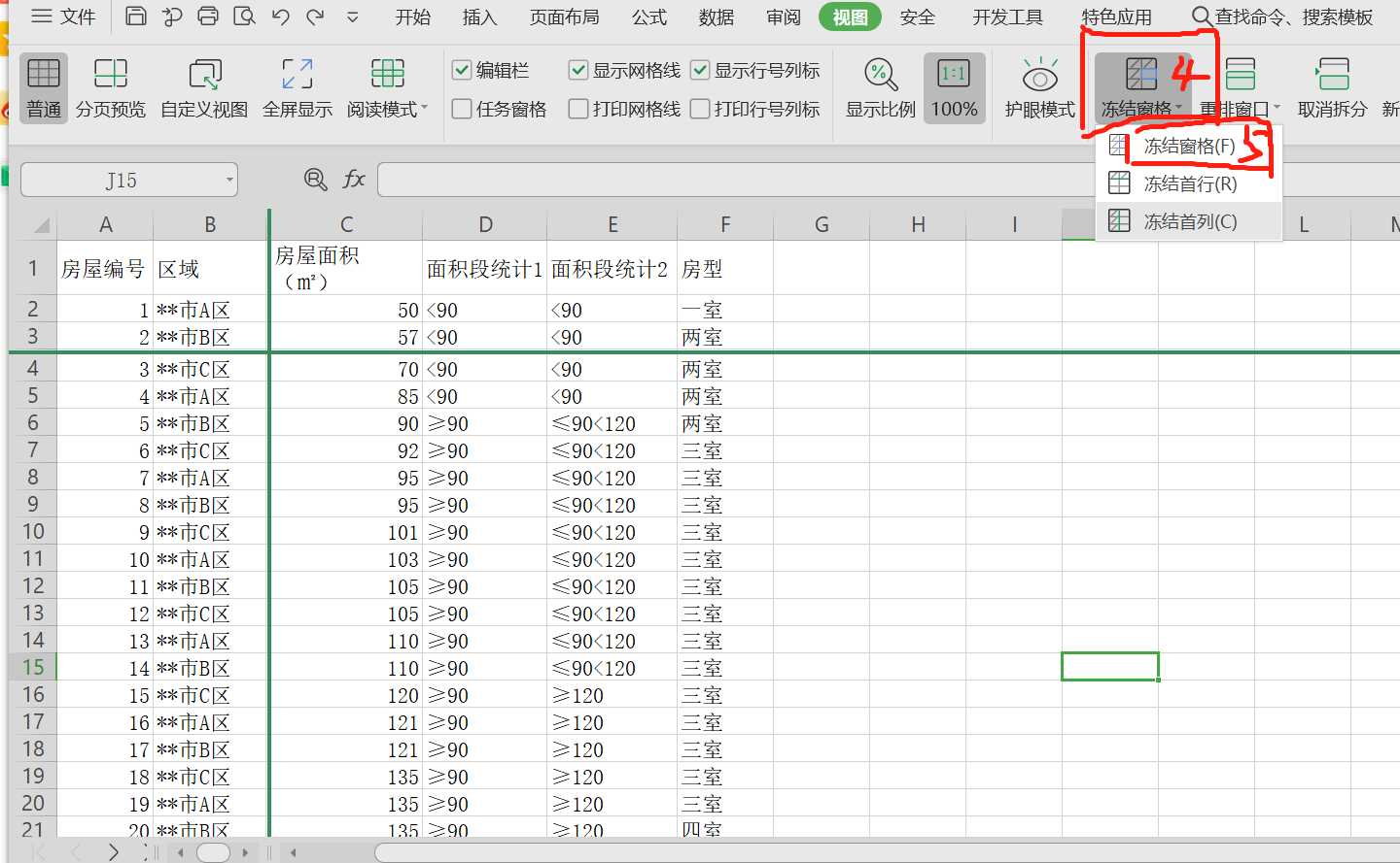 第四步:点击“冻结窗格”;
