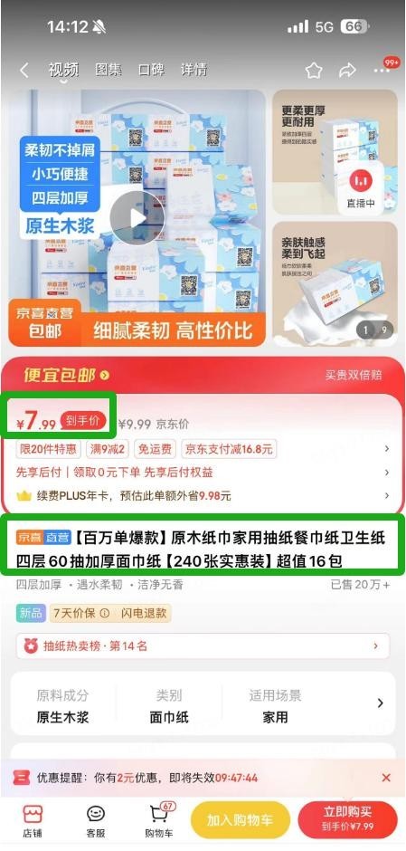 先从这个“五毛钱一包”的炸弹说起。原来,这是京喜直营放出的大招,这家伙悄无声息地搞了个低价突击,一下子把16包抽纸标到了7.99元。