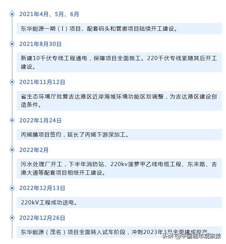 东华能源烷烃资源综合利用项目作为茂名建市以来引进的最大民营工业项目,是广东省2022年重点项目之一,总投资超1000亿元。该项目依滨海新区吉达港区而建,旨在滨海新区打造以丙烷脱氢为龙头的世界级绿色化工和氢能源产业园,项目从签约到开工建设仅用7个月时间。开工到建成,仅用19个月时间。